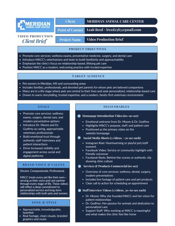 Meridian Animal Care Center is a full-service veterinary clinic in Meridian, Mississippi, known for its compassionate staff and trusted medical care. For this project, the goal was to support MACC’s brand visibility through a custom video marketing campaign that reflected the clinic’s values and services.