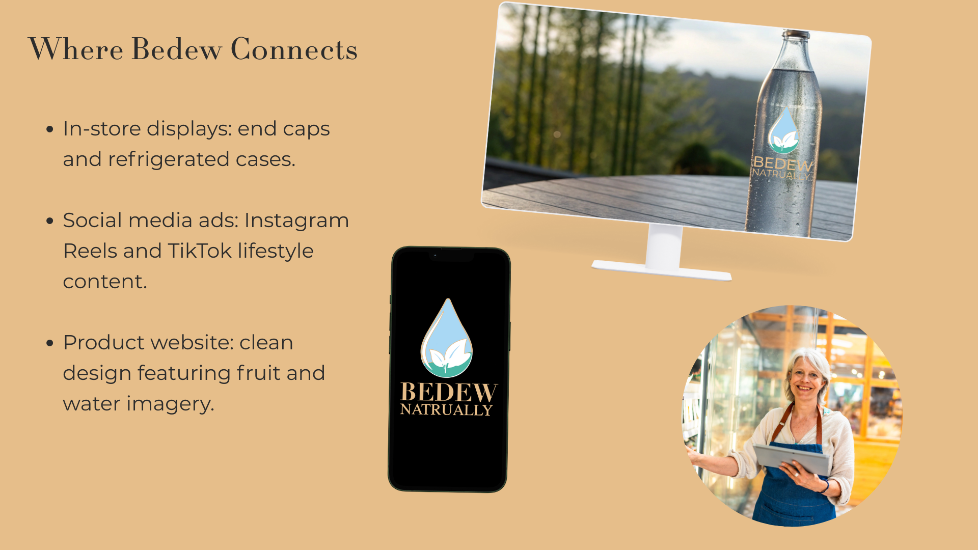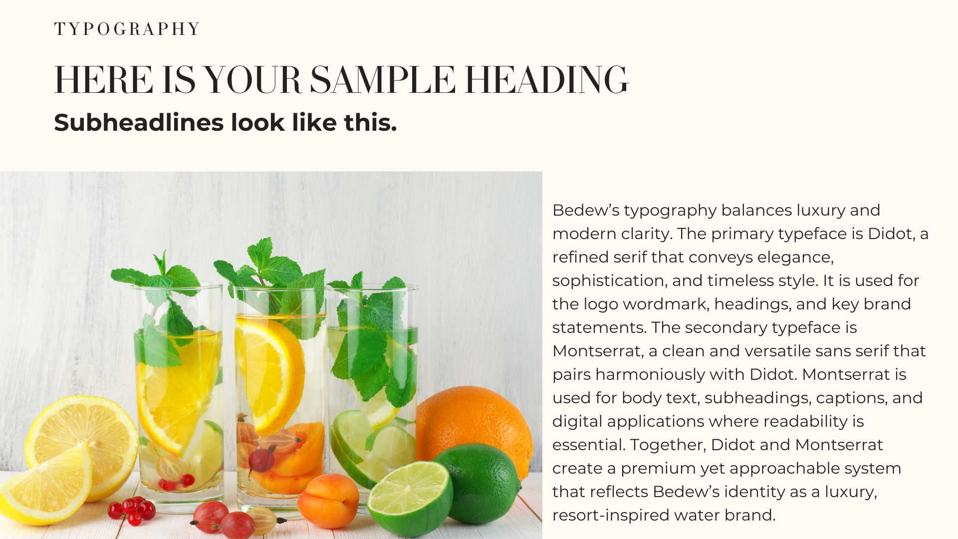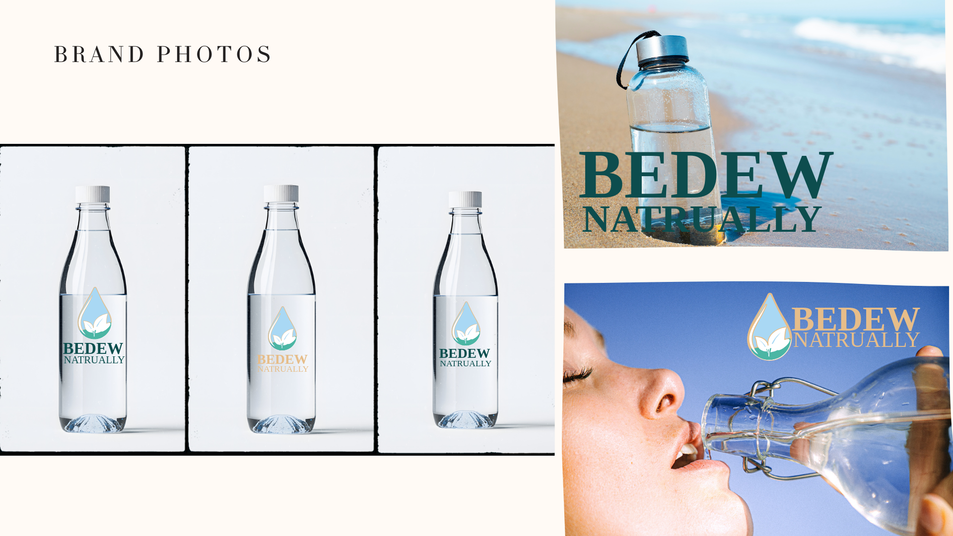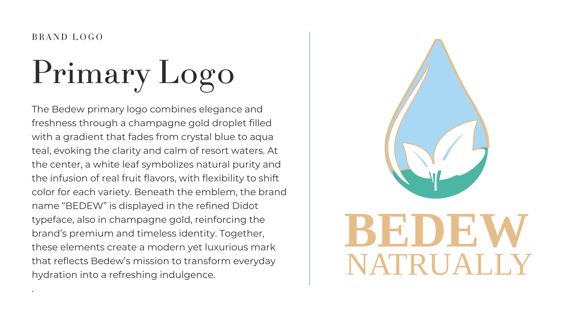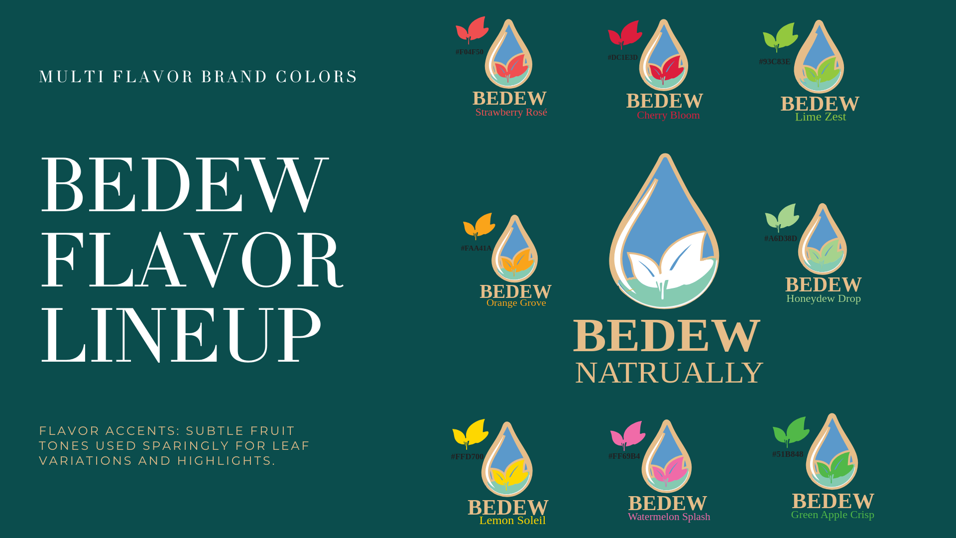 Bedew Water was a full branding concept developed for my graduate-level branding course. Based on the project guidelines, I acted as the branding expert tasked with creating a luxury-inspired flavored water line infused with natural fruit essences. I developed the complete brand identity—including the name, logo, color palette, typography system, and visual emblem—reflecting the elevated, spa-like experience of premium infused water.